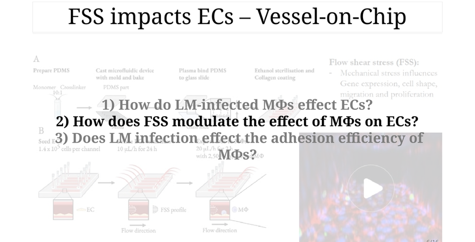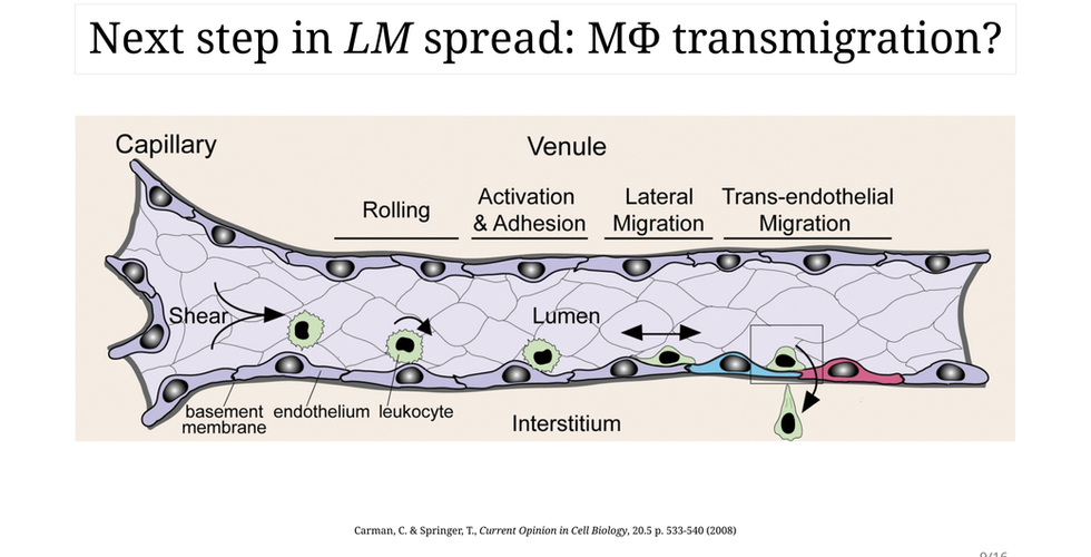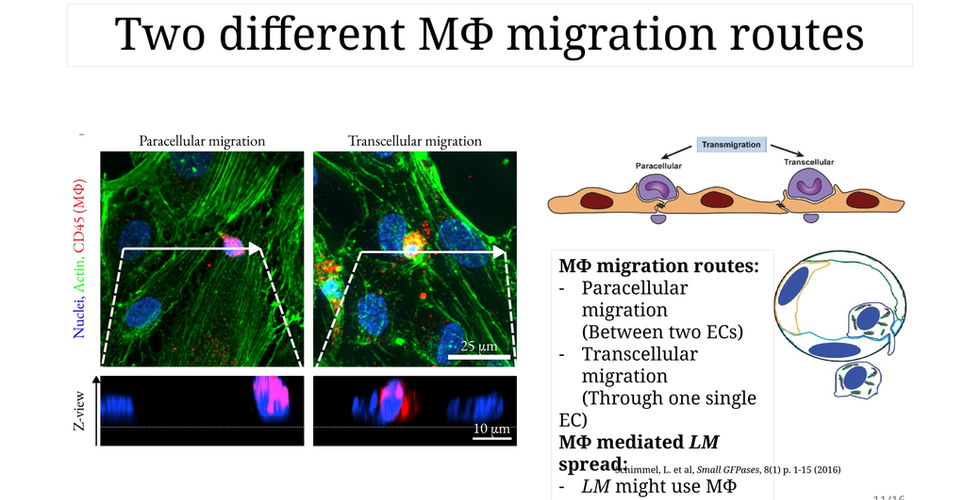Understanding macrophage (MΦ)-endothelial cell (EC) interactions is essential for comprehending the pathogenesis and systemic dissemination of Listeria monocytogenes (Lm), the causative agent of listeriosis. In recent years, listeriosis cases have risen across Europe, with over 2,900 confirmed infections and a mortality rate exceeding 50 % in 2023, primarily affecting vulnerable populations (EFSA and ECDC, 2024). Lm’s capacity to persist within host cells allows it to subvert the immune system. By hijacking MΦs, Lm leverages these cells as "Trojan horses" to breach endothelial barriers such as the blood-brain barrier, resulting in severe diseases. This study investigates how MΦs modulate EC morphology and alignment and how MΦ-infection impacts this. We observed that ECs polarize and collectively align after exposure to Lm-infected and uninfected MΦs. Using a microfluidic device to expose ECs to flow shear stress (FSS), we observed that flow-primed ECs polarized and collectively aligned in the direction of flow. This alignment was decreased upon exposure to uninfected MΦs, while Lm-infected MΦs had no significant impact. Furthermore, Lm-infected MΦs showed a 1.5-fold increase in adhesion to the EC monolayer. MΦs—infected and uninfected—showed transendothelial migration via both paracelluar and transcellular routes. Taken together, we discovered that infected MΦs adhere more efficiently to ECs and that in static conditions both FSS-priming, and MΦ exposure lead to collective EC alignment, which is decreased only by uninfected MΦ, but not by Lm-infected MΦs. These findings underscore how intracellular pathogens exploit immune cells and endothelial responses for systemic spread. Understanding this process better will be crucial for understanding how (un)infected MΦs interact with and transmigrate through the endothelium. Developing therapeutic strategies to target host cells rather than bacteria might be a promising approach to limit disease progression.
